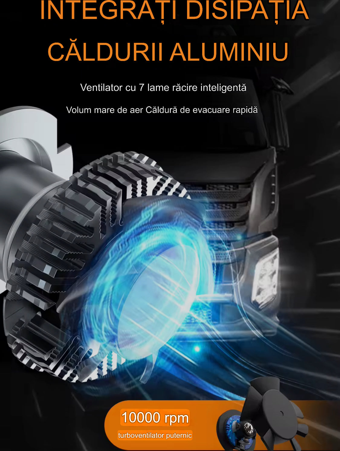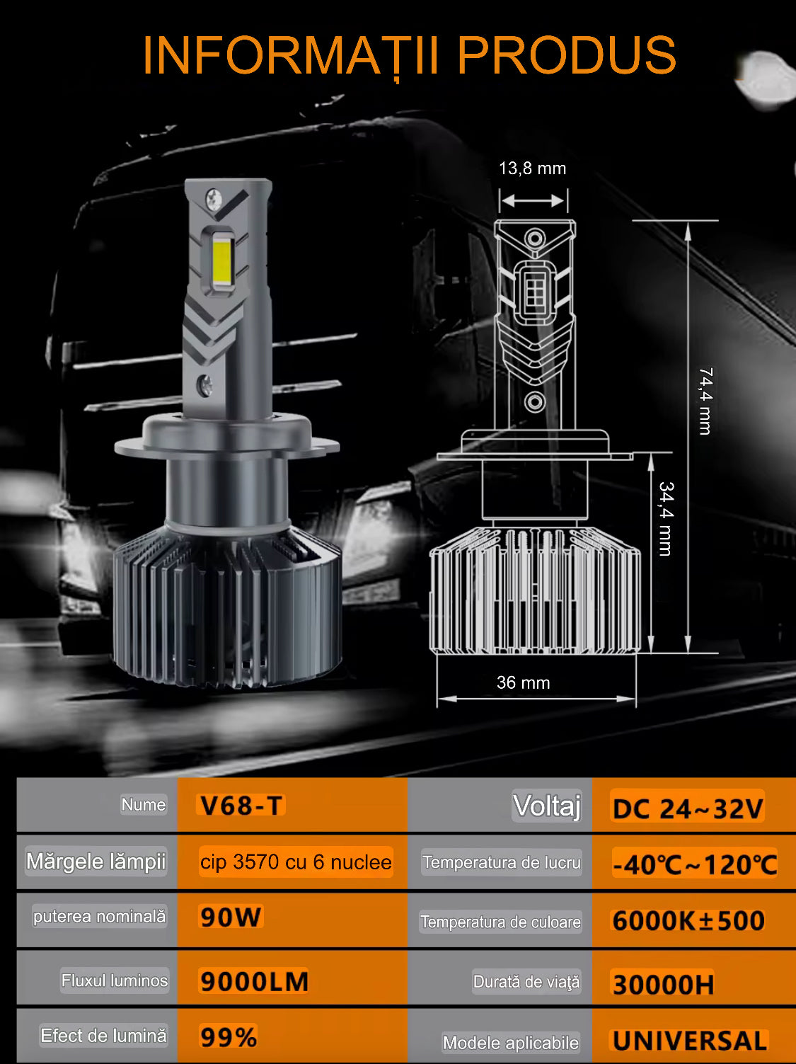 Becuri sunt proiectate pentru a funcționa la un voltaj de 24V și beneficiază de o racire activă cu ventilator, ceea ce previne supraincalzirea și asigură o durată de funcționare îndelungată de peste 40.000 de ore.