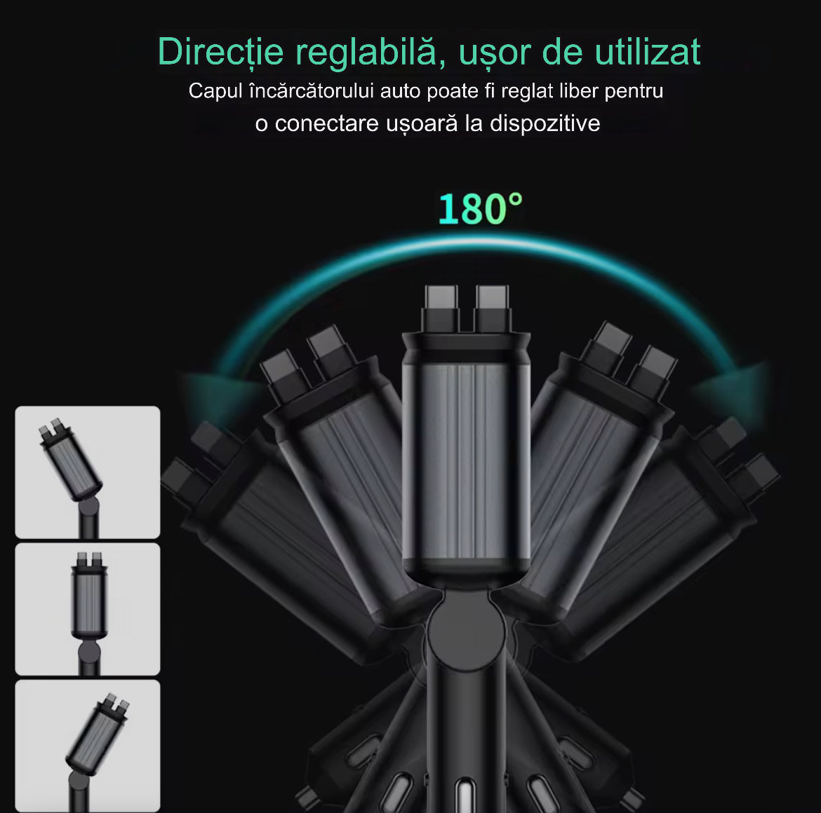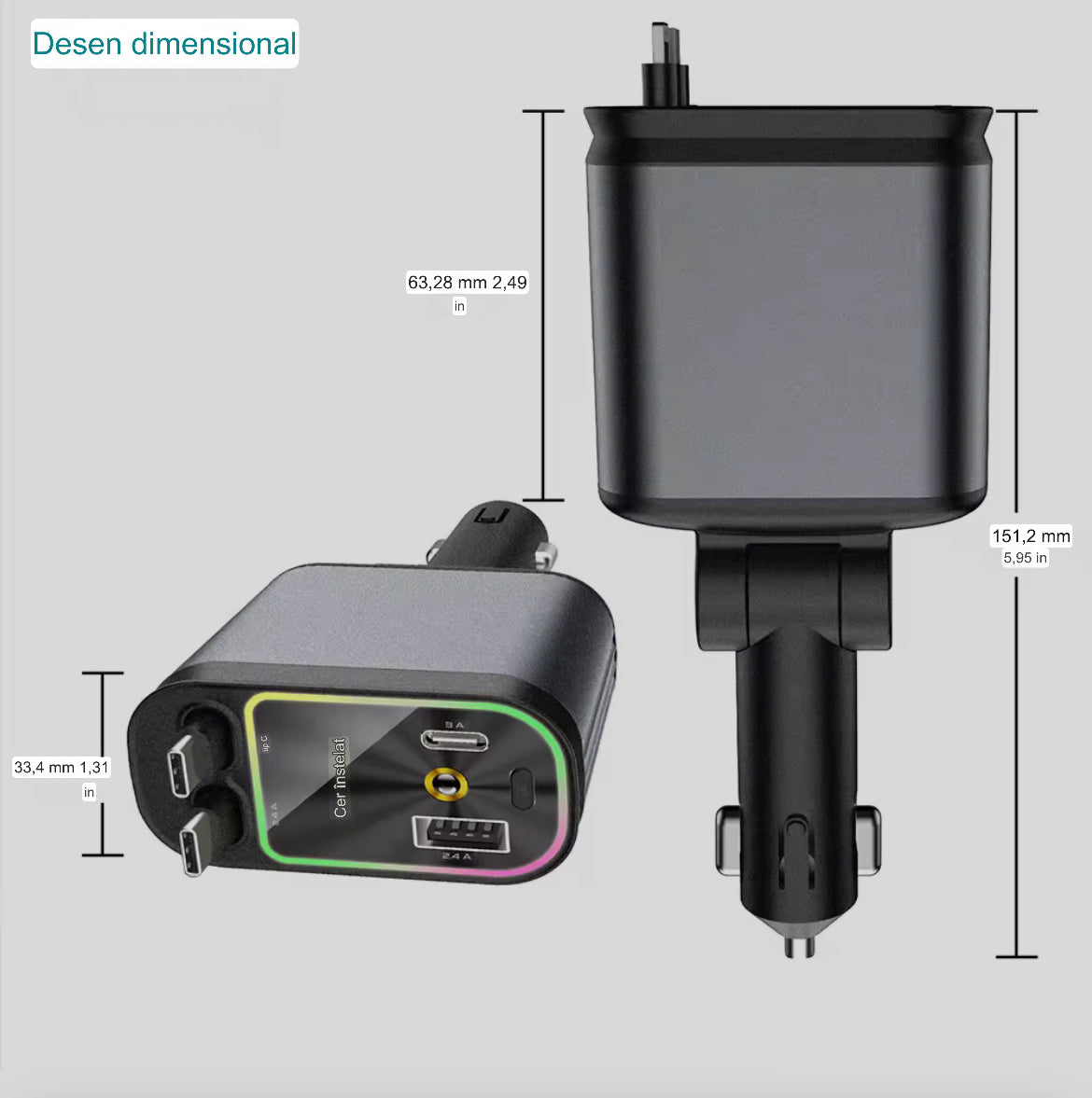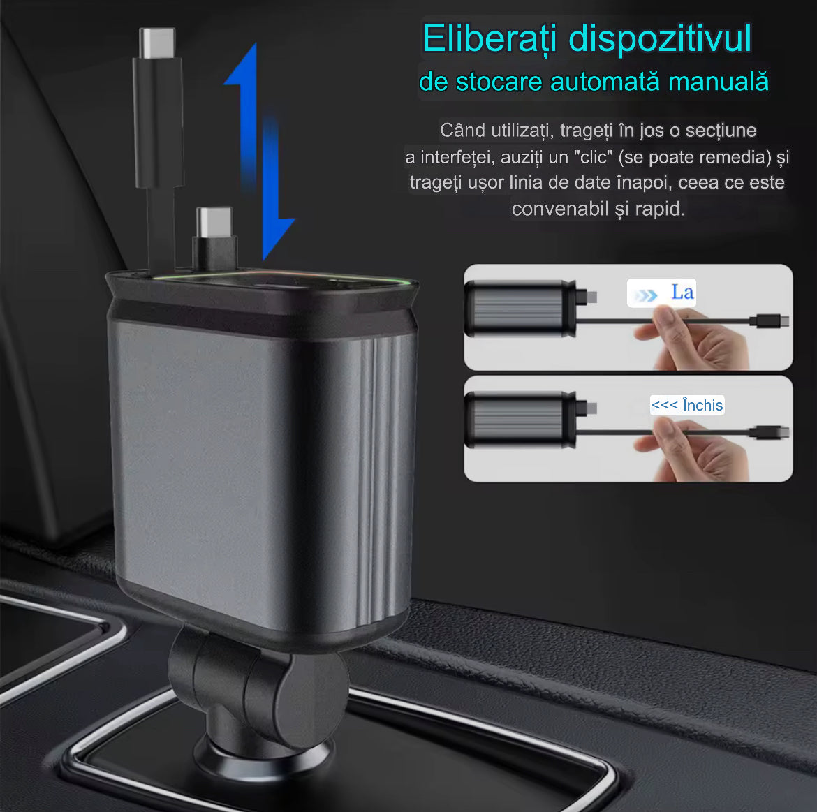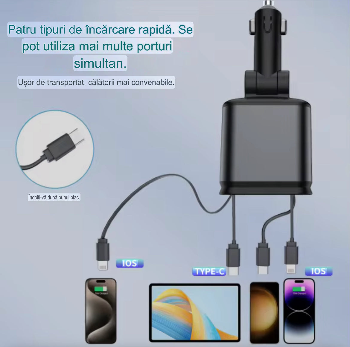 İncărcător auto 4-în-1 cu cabluri retractabile Type-C și Lightning + USB-A/USB-C, încărcare rapidă,afisaj voltaj si proiecţie led cer înstelat