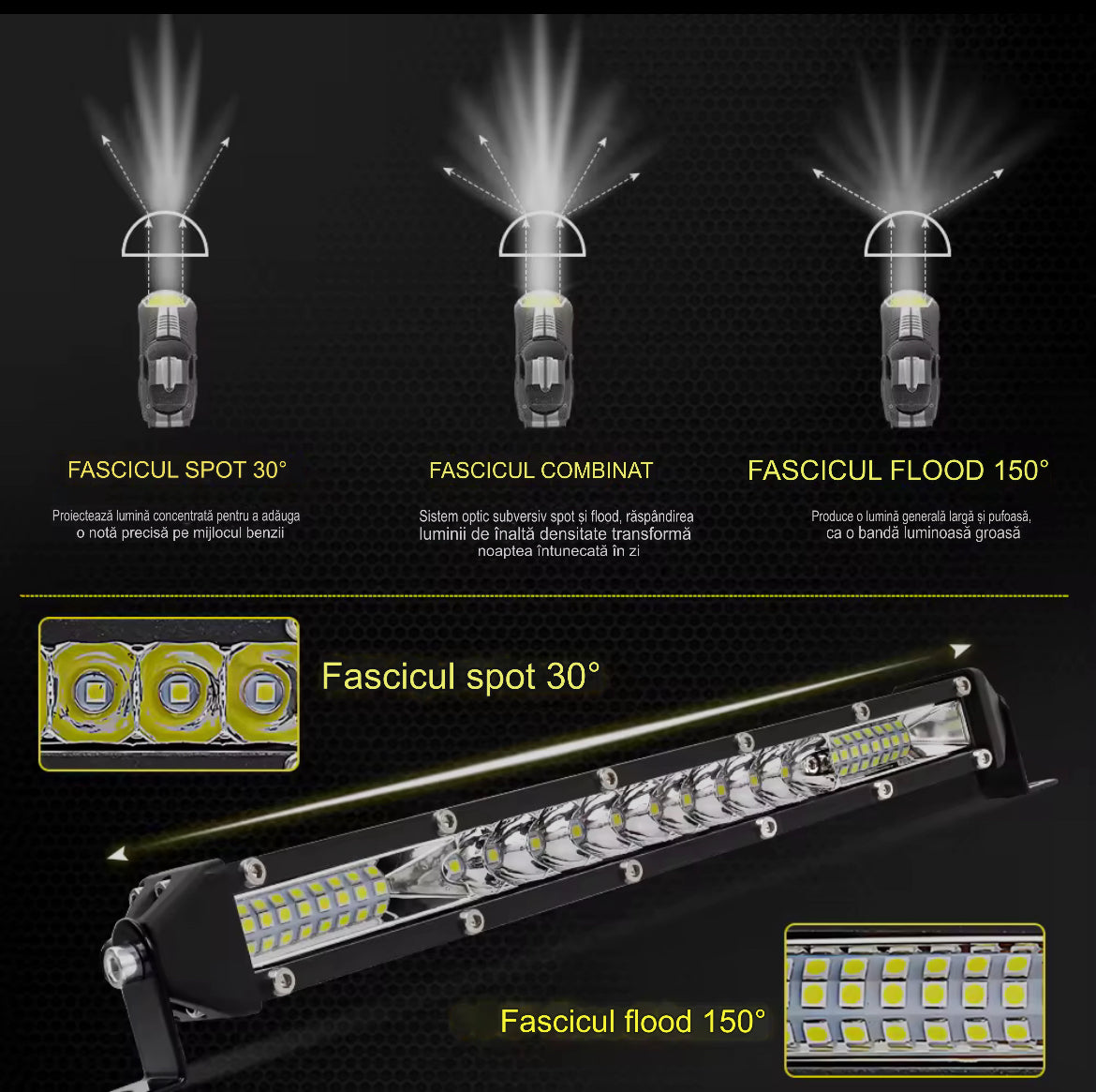 Unghi de iluminare: spot + flood (combinație pentru distanță și lățime)